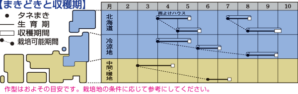 - 抽台が遅く、中間・冷涼地の春〜夏どりに適する。